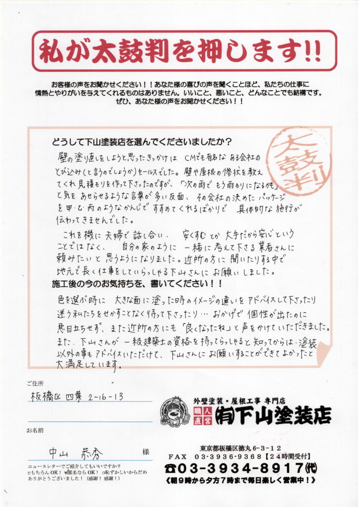 下山塗装店は板橋区で初代代表親方が創業し63年もの歴史を持つ地元に根付いた塗装店です。