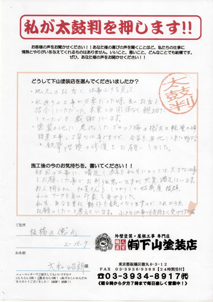 初回の工事に、満足し今年も私共にとっては大きな仕事をお願いした事で、お判りと思いますが、大変満足しています。